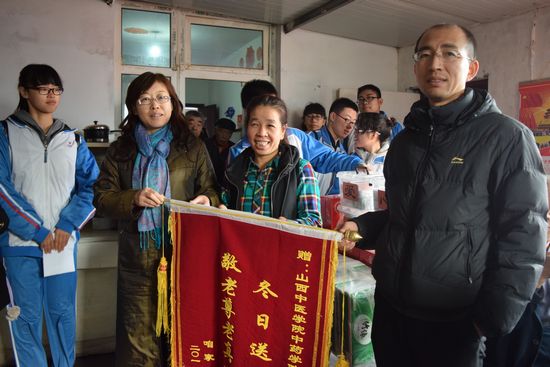 到达敬老院后,庞维荣和李刚与敬老院院长进行爱心捐赠交接,院长特为中药学院敬老志愿队颁发锦旗,以感谢中药学院长期以来对敬老院的支持与帮助。