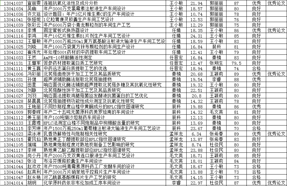 制药与食品工程学院2017届制药工程专业毕业设计(论文)考评成绩
