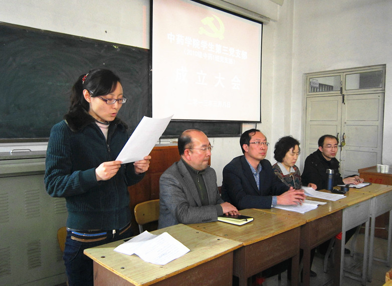 3月8日下午,中药学院学生第三党支部(2010级中药1班党支部)成立大会在2503教室召开。学院院长裴妙荣教授、党总支郭继林书记、副院长张朔生教授、2010级辅导员李刚出席大会。大会由分团委郭丽敏老师主持,2010级中药1班全体党员参加,入党积极分子列席会议。