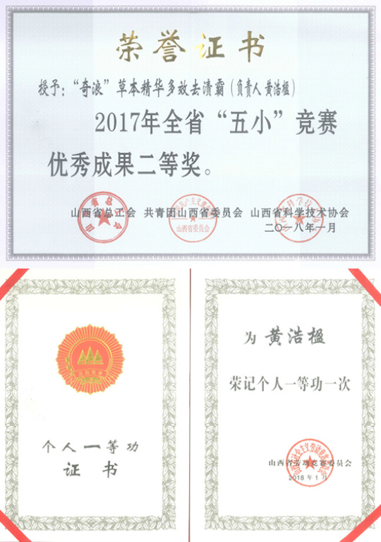在由省总工会、团省委、省科协联合举办的首届山西省“五小”竞赛活动中,买球官网中药学院2015级临床中药班黄浩楹同学的“奇浪”草本精华多效去渍霸作品喜获优秀成果二等奖,省劳动竞赛委员会为其荣记个人一等功一次并奖励8000元。