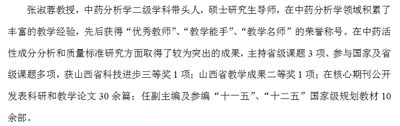中药学学科现有博士生导师6名,他们在中药学学科各领域如中药药性研究、中药复方化学、中药制剂新技术、中药神经药理等,拥有领先成果,受到国内外广泛关注。学术队伍中有省学科带头人1名,国务院特贴专家2人,省卫生系统有突出贡献专家2名,山西省委联系的高级专家3名,国家自然科学基金会评专家5名,导师队伍培养实力强,研究方向特色明显。