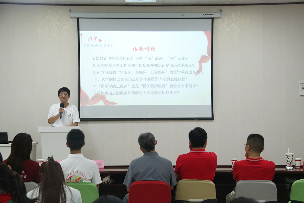 在“时代心声”分组讨论环节,支部成员围绕《高校短期志愿服务如何转化为长期基层医疗支持》等五个议题,与其他院校青年一起展开讨论。这场跨校交流既是思想碰撞,更是精神与力量的融合,彰显出青年对“健康中国”的践行与红医精神的传承。支部书记白珺受邀对“时代心声”讨论环节进行总结,肯定青年学子的思考深度与创新视角。