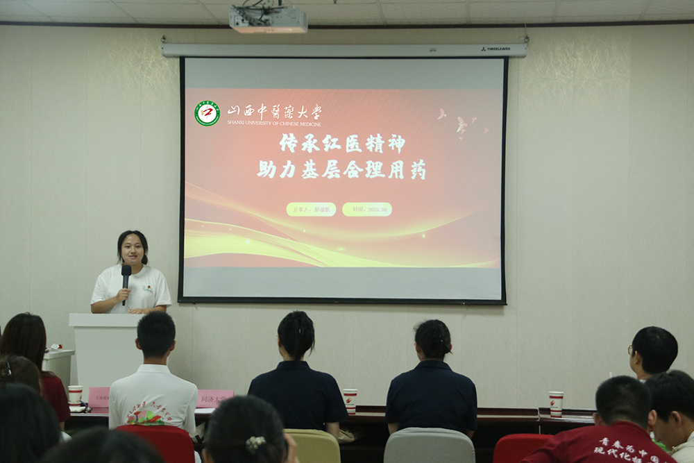 随后,在“我眼中的红医精神”青年论坛环节,支部学生党员郝渝凯进行了《传承红医精神 助力基层合理用药》主题分享,她讲述了井冈山革命斗争时期中医药是联系党和人民群众情感纽带的故事,并结合专业特色号召新时代医药青年通过促进合理用药,发扬红医精神。