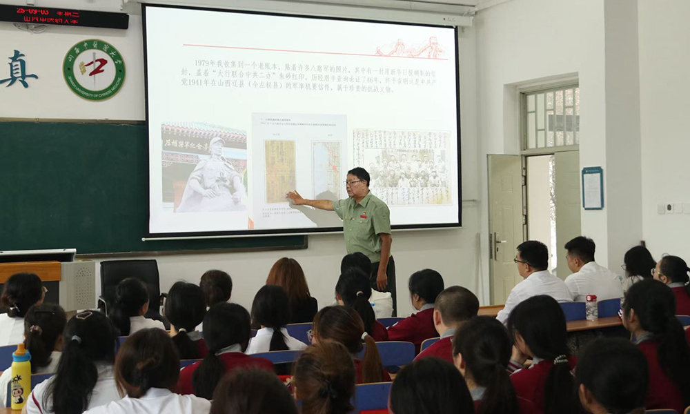 活动伊始,学院特邀山西省晋中市军队离退休干部休养所军休干部、原晋中军分区后勤部部长王战友作了题为《抗战史料寻踪与精神传承》故事分享会。虽年逾古稀,王战友同志仍以饱满的情感,用宝贵的史实资料还原了山西地区抗战岁月的波澜壮阔,他寄语同学要牢记历史、践行初心,发扬好传统中医药文化这个彰显中国智慧的“有利武器”。学生代表向其敬献鲜花,以表敬意。