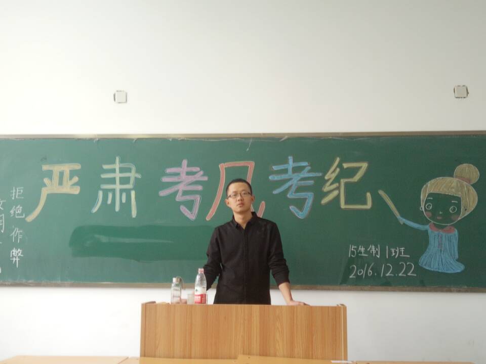 在期末考试临近之际,为营造良好的考风学风,杜绝弄虚作假、考试舞弊的现象,鼓励同学们争做文明诚信的大学生,2016年12月23日中午,我班在仁爱书院108教室组织全班学生开展“树立优良作风,严肃考风考纪”的宣传活动。
