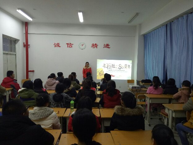 本次活动以ppt为主,首先让同学们了解了此次活动的目的。同学们都纷纷表示此次活动的必要性。然后由主持人简介长征的历程,同学们都听得非常激动,更知道了我们现在生活的来之不易。更有的同学热情激昂,给我们讲了许多他所知道的长征中的感人事情,真是深触人心啊。接下来主持人又带着我们了解了长征精神,长征胜利的重大意义以及习近平总书记在长征胜利80周年大会上发表的重要讲话。习近平总书记针对走好新的长征路提出了6个要求。可见国家对长征的重视和对长征精神的敬佩与传承。接下来是同学发言,谈谈自己身边有的“长征精神”。最后全班同学一起歌唱《闪闪的红星》。本次活动就在同学们激昂的歌唱中圆满结束。