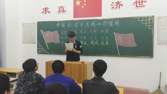 班长原杨朗诵梁启超先生的《少年中国说》为本次活动拉开了序幕,且充分的调动了同学们参与本次宣讲的积极性。随后,同学们围绕当今社会热点话题,即有关于青少年在公平、公正、文明、诚信等品行方面出现的不良行为展开了激烈的探讨。最后,通过对探讨结果的分析发现,这些不良现象的出现归根结底是人们心中信仰的缺失,而践行社会主义核心价值观以树立正确的人生观、世界观、价值观并为响应校团委集中开展学习"社会主义核心价值观"的号召,争做社会主义光辉旗帜下的新时代青年,传播正能量。4月17日晚上7点半,1提高精神文明建设是重铸他们心中信仰的重要桥梁。