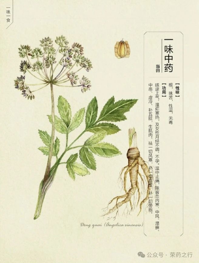 由此也可佐证当归的药用历史可以追溯到东汉时期,而后,各位医家对当归的使用也在不断拓展延续。当归药性为甘,辛,温。归肝,心,脾经。有着“补血之圣药”之称。可见当归是一种常用的补血药,具有多种药效,如补血、活血、调经、止痛等。在中医治疗中,当归常常与其他药物配伍使用,以达到更好的治疗效果。当归常用于治疗贫血、月经不调、痛经、产后瘀血等妇科疾病,以及各种虚证,如气虚、血虚等等。若遇到血虚萎黄,心悸失眠以及妇女月经不调,经闭,痛经等血虚证,在《和剂局方》中有一方剂,使用当归配伍熟地黄,白芍,川芎来治疗,即四物汤。若月经不调、证属冲任虚寒、瘀血阻滞者,可配伍白芍、桂枝、吴茱萸等,即温经汤;证属肝郁气滞,可配伍柴胡、白芍、白术等,即逍遥散。当归也是活血行瘀的良药。可以治疗虚汗腹痛,风湿痹痛,跌仆损伤,痈疽疮疡。如当归建中汤,配伍桂枝助阳化气,生姜温中健胃,白芍养血调经,以及十全大补汤可以配伍黄芪补气升阳,人参滋阴益气,肉桂散寒助阳等等。