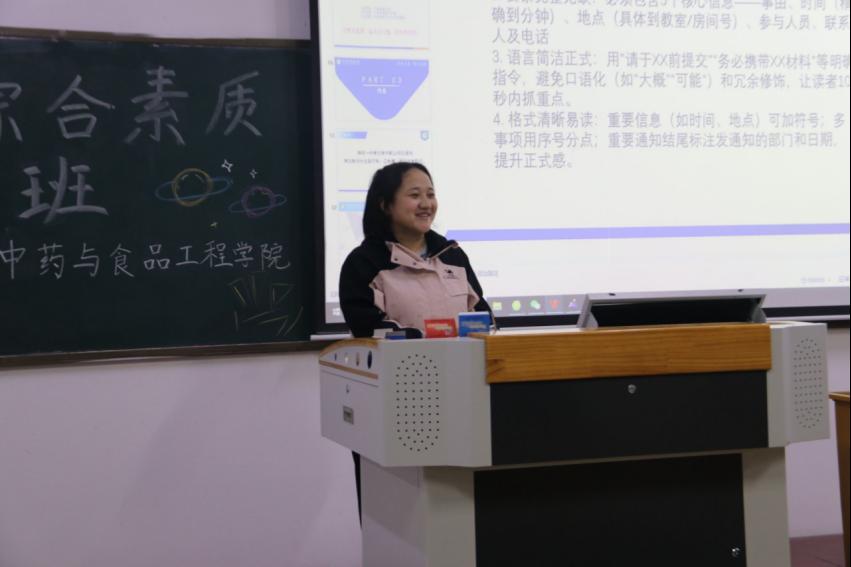 陈雨欣从办公软件以及制作PPT两个方面展开讲解,通过讲解各种常用的办公软件的一些排版、文字等细节和PPT的指导,并且鼓励同学们多学、多看、多练习才能做到得心应手。