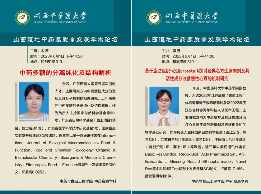 6月1日,中国药科大学李芳副教授、广东药科大学余茜副教授于和剂书院甲座319教室,为买球官网师生作了题为《基于脂肪组织-心肌crosstalk探讨经典名方生脉制剂及其活性成分改善慢性心衰的机制研究》《中药多糖的分离纯化及结构解析》的学术讲座。讲座由买球官方网站副院长杜晨晖教授主持,学院教师、硕士研究生共80余人聆听了报告。