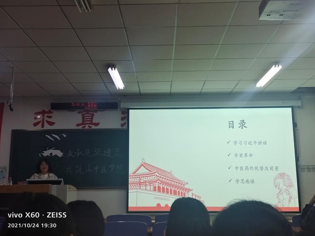 10月24日晚,临床中药二班团支书谭雅菲带领全班同学在和剂甲座319教室开展了关于"秉承先驱遗志,共筑山中医梦想"的主题团日活动。全班同学积极踊跃地参加此次团日活动。