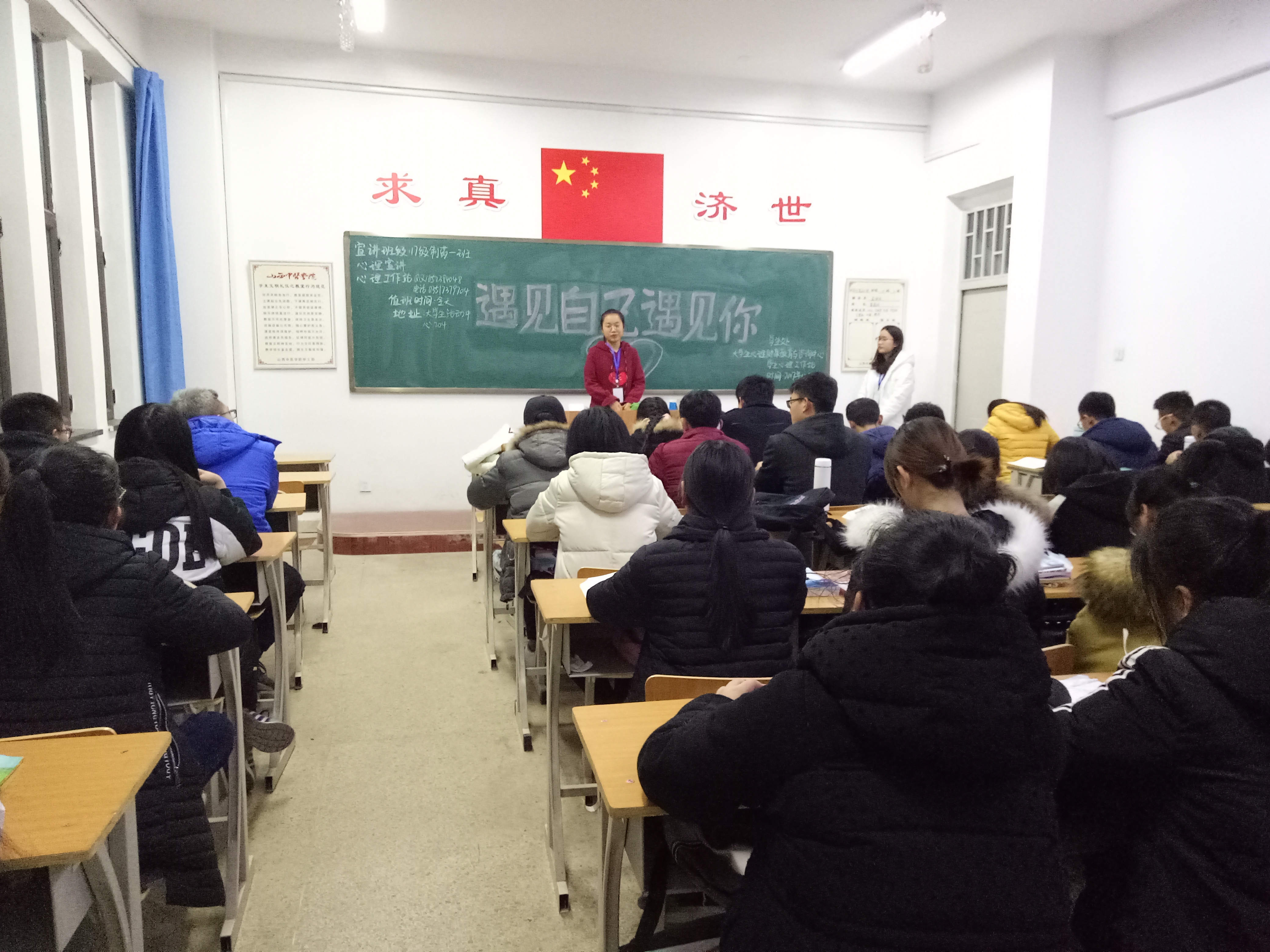 此次请来了学生心理工作站的同学为我们班进行恋爱宣讲,主题是“遇见自己遇见你”,本次于2017年1 2月4日晚上七点半,在和剂205教室举办,这是我们班这学期的第五次心理活动了。同学们积极配合宣讲的同学,整个活动进行的很顺利。