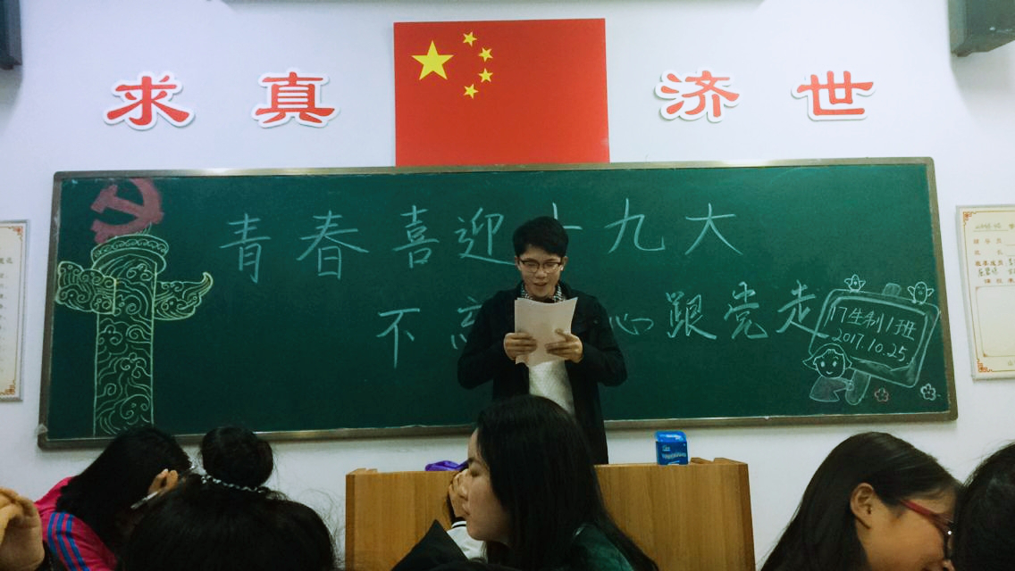 为了团结引领广大青年听党话、跟党走,以奋发向上的精神状态迎接党的十九大,以高度的思想和行动自觉学习贯彻党的十九大,2017级生物制药1班于10月25日晚7时30分在和剂书院甲座203教室举办了以“青春喜迎十九大,不忘初心跟党走”为主题的团日活动。本次班会由团支书林甜主持,组织委员姬秋月辅助完成,生制一班全体同学参加。