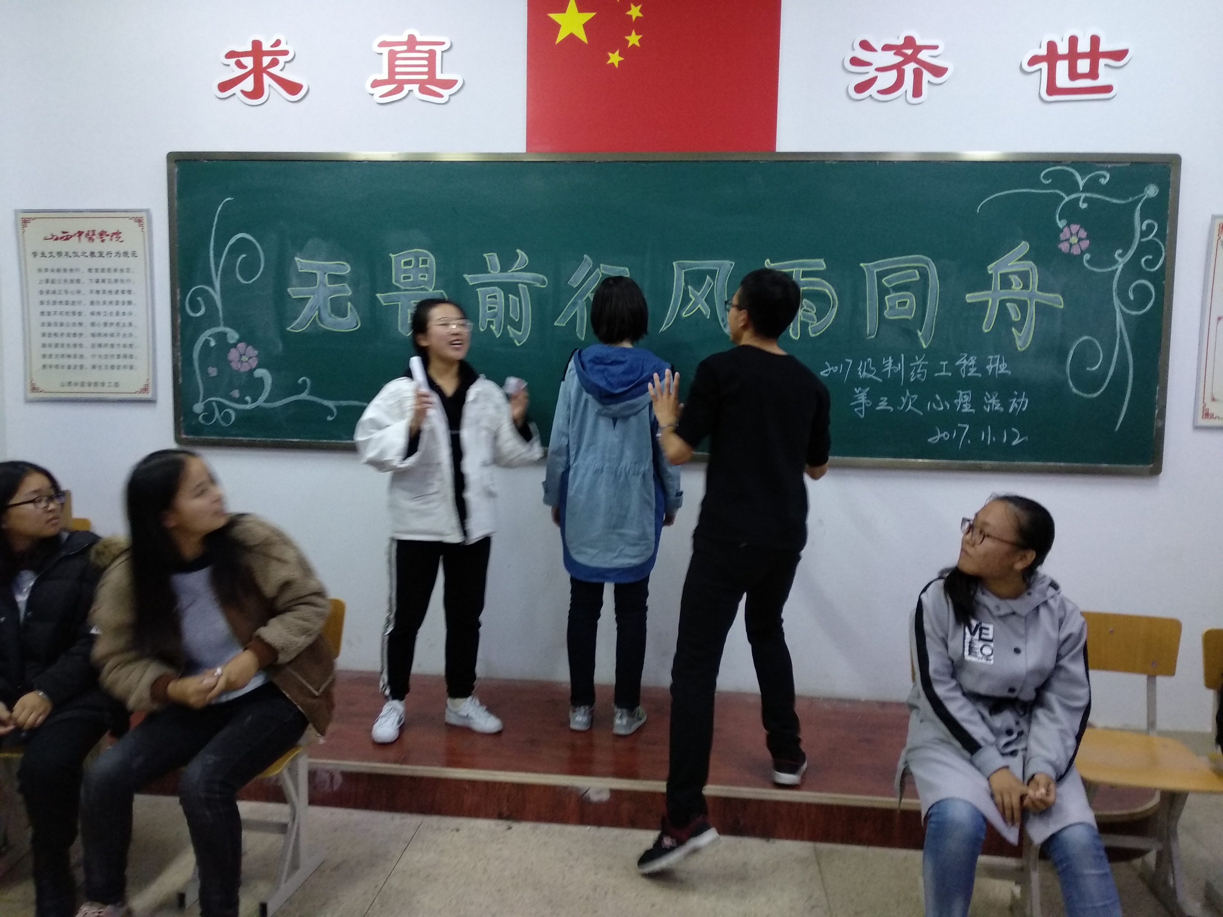 为了增进同学间的感情,使同学之间加深了解,2017年11月12号晚七点半,一七级制药工程班于和剂书院甲座205教室举办“无畏前行,风雨同舟”主题心理活动。