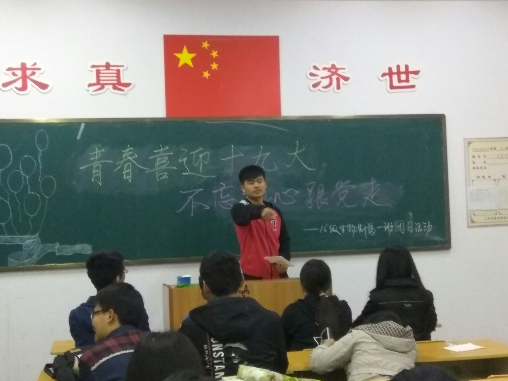 为了更好的迎接和学习十九大精神,学习习近平总书记系列重要讲话,进一步提升买球官网学生的思想政治素养,2016级生物制药一班全体同学于2017年4月21日晚上七点整,在和剂书院甲座305教室开展“青春喜迎十九大,不忘初心跟党走”主题团日活动。