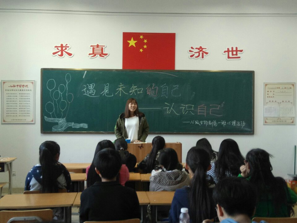 作为一名大学生,对自己有充分而全面的认知重要的,能够认识自己,才能更好地发展自己,促进自己的发展2016级生物制药一班全体同学于2017421日下午点整,在和剂书院甲座305教室开展“遇见未知的自己”主题心理活动。